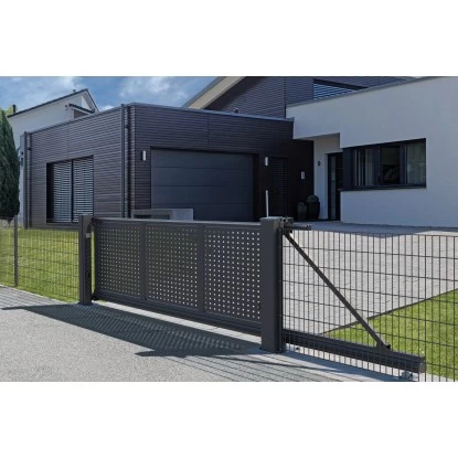 Das hochwertige Schiebetor ist aus kunststoffbeschichtetem Aluminium in Anthrazit (RAL 7016) gefertigt und dadurch besonders langlebig sowie pflegeleicht. Das hochwertige Schiebetor ist aus kunststoffbeschichtetem Aluminium in Anthrazit (RAL 7016) gefertigt und dadurch besonders langlebig sowie pflegeleicht. Das Tor ist gefüllt mit Lochblech mit einer Abmessung von 20 x 20 mm. Es funktioniert voll automatisch und ist somit komfortabel, aber auch sicher.
