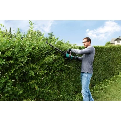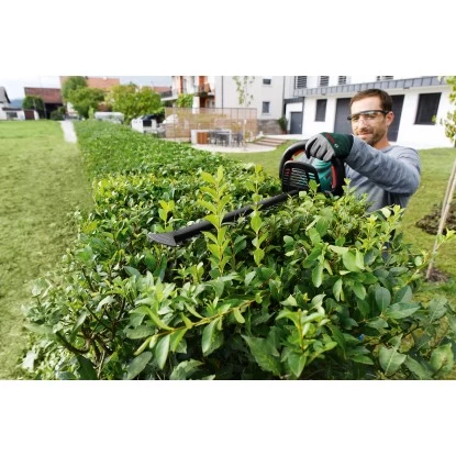 Der AHS 55-20 LI Heckentrimmer stutzt Hecken und Büsche mühelos. Durch das Anti-Blockier-System, das vor dem Verhaken der Schere im Ast schützt, wird ein kontinuierliches Arbeiten gewährleistet. Darüber hinaus sorgt die Quick-Cut-Technologie für eine saubere Schnittleistung, denn Zweige und Äste werden schon beim ersten Schnitt erfasst. Auch knorrige Zweige werden dank Sägefunktion mit bis zu 25 mm Durchmesser nicht zum Problem. In allen Lagen flexibel einsetzbar ist der Bosch Heckenschneider durch den Messer-Protector, der auch das sichere Schneiden entlang von Mauerwerk und anderen Flächen möglich macht. Das Messerwerk ist so konstruiert, dass es nicht mit dem Boden/Mauern in Berührung kommen kann. Dies ist bei verwinkelten Hecken, die nah an einer Mauer wachsen, besonders hilfreich.