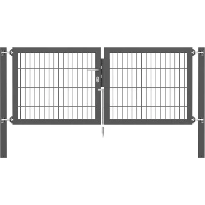 Das Doppeltor Flexo Plus kann in einen Gartenzaun integriert werden und dient beispielsweise der Grundstücksbegrenzung. Das Tor ist aus feuerverzinktem Stahl gefertigt und damit zuverlässig gegen Rost geschützt. Die Torfüllung ist aus Doppelstabmatte. Als Komplettangebot erfolgt die Lieferung inklusive Einsteckschloss, Türdrücker, Pfosten, Torbändern und zwei Torrückhaltern. Lediglich der Zaunanschluss ist nicht im Lieferumfang enthalten, kann aber separat bestellt werden.