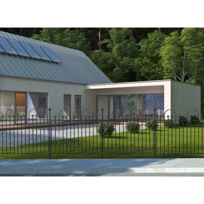 Die Floraworld Dekor-Zaunmatte Alizia Anthrazit 79,5 cm x 95 cm ist anthrazit pulverbeschichtet und eignet sich hervorragend zum Abgrenzen von kleinen Grundstücken, Gartenteichen, Beeten oder an Gehwegen. Zum Aufbau werden die einzelnen Zaunelemente einfach über praktische Pfosten (nicht im Lieferumfang enthalten) verbunden. Die Aufbaumöglichkeiten sind vielfältig und gestatten viel Raum für eine individuelle Gartengestaltung, Gesamthöhe 79 cm, Höhe am Pfosten 58 cm, Breite mit Ösen 95 cm / ohne Ösen 87 cm, empfohlene Pfostenlänge 89 cm