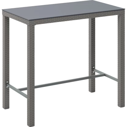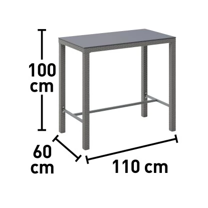 Der graue Garten-Bartisch Goolong besitzt eine moderne Gestaltung in rechteckiger Form. Er eignet sich für den Garten oder die Terrasse. Hergestellt ist er aus handgeflochtenem Polyrattan, das durch ein Stahl-Gestell verstärkt ist. Ausgestattet ist er zudem mit einer Tischplatte aus getöntem Glas in der Farbe Gau. So ist der Gartentisch pflegeleicht und witterungsbeständig. Das Gestell verfügt über Verstrebungen in den Seiten und in der Mitte, wodurch eine hohe Stabilität erreicht wird. Mit den Abmessungen von 110 cm in der Breite und 60 cm in der Tiefe bietet er Platz für bis zu sechs Personen. Durch seine Höhe von 100 cm kann er mit passenden Barstühlen oder als Stehtisch verwendet werden. Das Gewicht beläuft sich auf 16 kg.