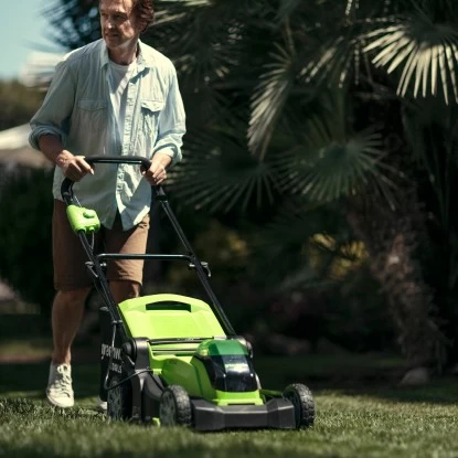 Der Akku-Rasenmäher G40LM41K4 von Greenworks eignet sich für kleine bis mittelgroße Rasenflächen. Der Akku-Mäher ermöglicht einen kabellosen Betrieb und bietet somit maximalen Bewegungsfreiraum beim Mähen.