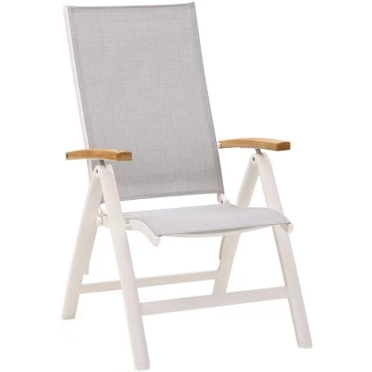 Der komfortable Gestellrahmen und die Gelenkteile sind komplett aus Aluminium und somit absolut korrosions- und witterungsfest und leicht im Handling. Das Gestell ist pulverbeschichtet und in zwei Farben erhältlich. Ergonomisch geformter Sitz und Rückenlehne mit atmungsaktiver Bespannung aus reißfestem Ergotex-Gewebe. Bequeme, breite Armlehnen aus edlem, witterungsbeständigem Teak-Holz. Die Rückenlehne ist mehrfach verstellbar.