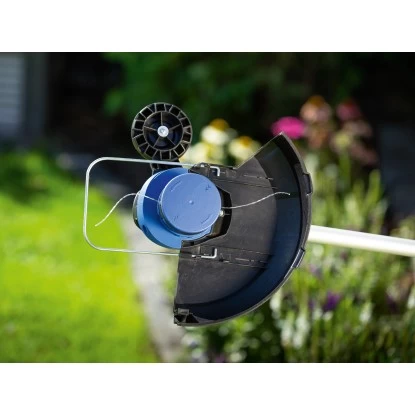 Um Ihre nahegelegenen Beetpflanzen oder Blumen vor Beschädigungen zu schützen, ist der Rasentrimmer mit einem Pflanzenschutzbügel versehen. Da das Gerät von 96 cm – 130 cm teleskopierbar ist, bietet es Ihnen eine entspannte Körperhaltung unabhängig von Ihrer Größe. Für ein komfortables Kantenschneiden verfügt es über ein praktisches Zusatzrad. Durch den verstellbaren Zusatzhandgriff ermöglicht der Elektro-Rasentrimmer eine bequeme Geräteführung. Sein drehbarer und abwinkelbarer Schneidkopf lässt sich in der Neigung anpassen, wodurch Sie auch unter Hindernisse und schwer erreichbare Flächen gelangen.