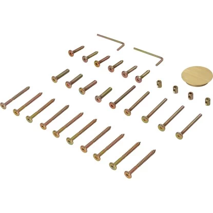 Das 31-teilige Montageset dient dem kompletten Aufbau des ovalen Esstisches aus der Gartenserie Chelsea. Er verbindet die einzelnen Elemente des Untergestells miteinander und sorgt für eine sichere Befestigung der ausziehbaren Tischplatte. Der Montagesatz besteht aus Schrauben in unterschiedlichen Ausführungen und passenden Hülsen. Gefertigt ist er aus galvanisiertem Stahl mit rostfreien Merkmalen. Ebenfalls enthalten ist eine runde Abdeckung für den Schirmmast aus holzfarbenem Kunststoff. Eine unkomplizierte Montage ermöglicht das zugehörige Inbusschlüssel-Set.