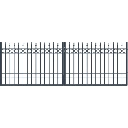 Das Polargos Doppeltor Oxford mit Zubehör besteht aus vertikalen Streben und einem Rahmen. Es eignet sich dank seiner geraden Linienführung für klassische Gebäude. Es ist ein System von geschweißten Stahlprofilen. Das Paket beinhaltet Klinken, 4 x Scharniere, ein Schloss und Montagezubehör. Sie müssen 2 x Pfosten mit Nietmuttern und oder 4 x Maueranker kaufen.