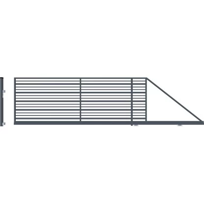 Das Polargos Schiebetor Rubin mit Gegengewicht und Zubehör besteht aus horizontalen Streben und einem Rahmen. Es eignet sich dank seiner geraden Linienführung sowohl für klassische als auch für moderne Gebäude. Es ist ein System von geschweißten Stahlprofilen. Das Paket beinhaltet Hakenschloss, Endpfosten, Führungspfosten und Montagezubehör.