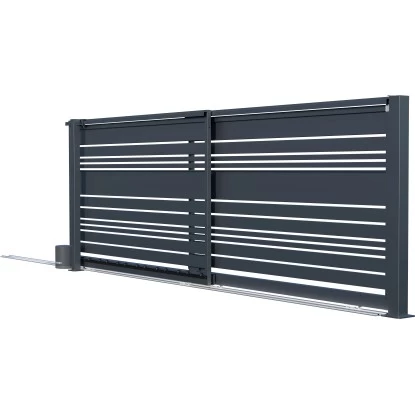 Das Polargos Teleskop-Schiebetor Lavender mit elektrischem Antrieb besteht aus horizontalen Streben und einem Rahmen. Es eignet sich dank seiner geraden Linienführung für moderne Gebäude. Es ist ein System von geschweißten Stahlprofilen. Das Paket beinhaltet Antrieb, Endpfosten, Führungspfosten und Montagezubehör.
