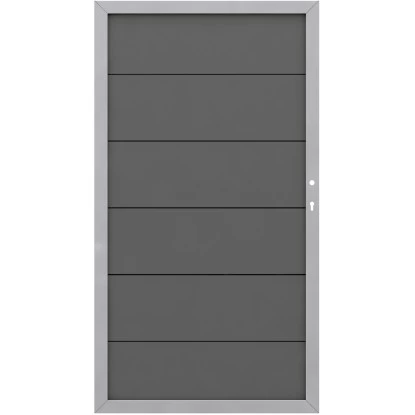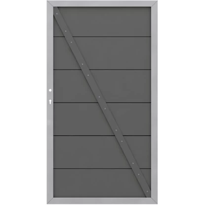 Beim robusten Sichtschutzzaun Tor Design WPC Alu sind 6 Profile in dem umlaufenden Metallrahmen fixiert. Zusätzliche Stabilität gewährt die rückseitige Diagonalverstrebung. Der Torrahmen ist mit einer Tiefenbohrung versehen, in die das mitgelieferte Einsteckschloss eingebaut werden kann. Verwenden Sie zur Montage die Universal-Torpfosten Silber oder Anthrazit. Das Tor Design WPC Alu wird DIN rechts anschlagend montiert.