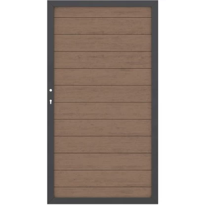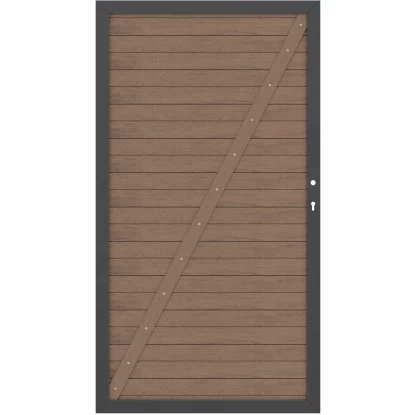 Beim robusten Sichtschutzzaun Tor System WPC sind 12 Profile in dem umlaufenden Metallrahmen fixiert. Zusätzliche Stabilität gewährt die rückseitige Diagonalverstrebung. Der Torrahmen ist mit einer Tiefenbohrung versehen, in dem das Einsteckschloss mit Buntbartzylinder fest eingebaut ist. Verwenden Sie zur Montage die Universal-Torpfosten Anthrazit.