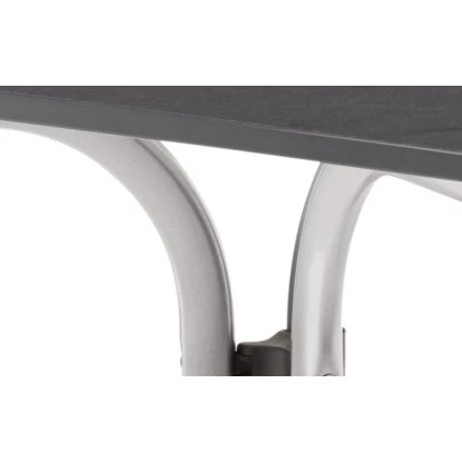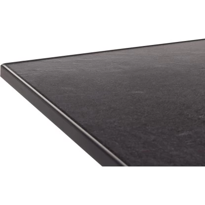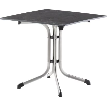 Der Boulevard-Klapptisch hat die Maße 80 x 80 cm und ein Gestell aus Stahlrohr. Die vivodur®-Tischplatte ist Schiefer Anthrazit. Der Tisch ist platzsparend zusammenklappbar. Die robuste Tischplatte ist wetterfest, glutfest und kältebeständig. Zudem hat sie eine hochschlagfeste Plattenkante. Das Untergestell ist hochwertig und polyesterbeschichtet.