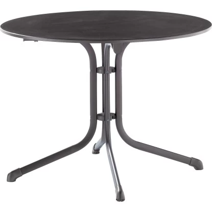 Der Boulevard-Klapptisch hat ein eisengraues Gestell aus polyesterbeschichtetem Profil-Stahlrohr mit einer Rohrstärke von 35 x 28 mm und eine formschöne vivodur®-Schieferdekorplatte in Anthrazit. Die Tischplatte hat einen Durchmesser von 100 cm. Durch die Polyesterbeschichtung wird das Gestell unempfindlich gegen Witterungseinflüsse. Die Höhe des Tisches beträgt ca. 73 cm. Damit der Tisch auch auf unebenen Flächen einen festen Stand hat, wurde er mit einem Höhenausgleich ausgestattet. Durch seine Klappfunktion ist der Tisch sehr einfach in der Handhabung. Ein weiterer Pluspunkt für diesen Artikel ist, dass er montagefrei angeliefert wird. So können Sie den Tisch sofort nach Erhalt problemlos in Gebrauch nehmen. Insgesamt profitieren Sie bei diesem Artikel von der jahrzehntelangen Erfahrung, die Sieger bei der Herstellung von Gartenmöbeln vorweisen kann. Der Tisch lässt sich ideal mit Möbeln aus dem Sieger-Sortiment kombinieren.