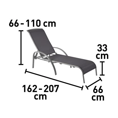 Bei dem stabilen und doch leichten Rahmenmaterial handelt es sich um pulverbeschichtetes Aluminium. Der pflegeleichte Rahmenbezug besteht aus einem strapazierfähigen Textilen-Gewebe. Für ein angenehmes Liegegefühl ist es luftdurchlässig und fühlt sich weich an. Zudem heizt es sich nicht in der Sonne auf. Sowohl das Gestell als auch der Bezug sind witterungsbeständig und dadurch sehr langlebig. Durch die mehrfach verstellbare Rückenlehne finden Sie jederzeit die optimale Sitz- oder Liegeposition für sich. Für die platzsparende Aufbewahrung ist sie mit wenigen Handgriffen zusammenklappbar. Mit den Maßen von 100 cm x 66 cm x 207 cm (H x B x T) verfügen Sie über eine ausladende Liegefläche.