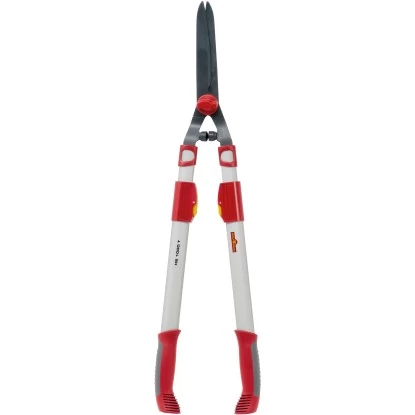 Die Wolf-Garten Teleskop-Heckenschere HS 1000 T bietet hohe Flexibilität durch verstellbare Holme, die sicher einrasten. Die ergonomischen Zweikomponenten-Griffe und der stoßdämpfende Anschlagpuffer schonen die Gelenke. Die Messervorspannung ist individuell einstellbar.